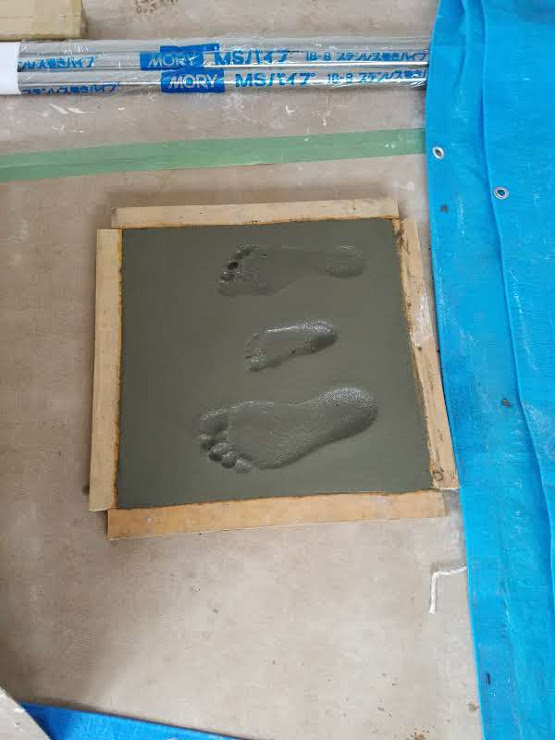 さ、さて 千曲市の現場 N様邸の工事もいよいよお引渡しに向け ラストスパートです。お打合せの段階から 玄関のモルタル部分に家族の手形か足形をつけたいんです!という可愛らしいリクエストがあり では 土曜日に現場にて手形もしくは足形つけ式、とり行いましょう と 予定しておったのですが 台風の影響で当日は雨。。。そして 来週の週末もお天気悪そうだし、ということで寡黙な現場監督は考えた!枠を作ってそこにモルタルを練ってとりあえず 形 取っちゃいましょう!そして 取りました。
