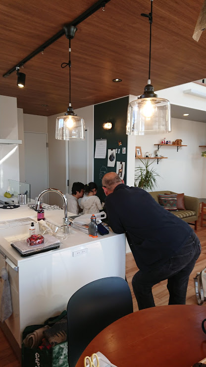 悩ましい姿勢の方は カメラマンさん。御主人と 娘ちゃん マグネット下地の黒板ボードにお絵かきシーンです。