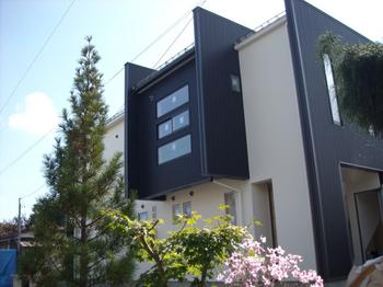 黒いガルバリウムと白い吹付のツート-ンが目印です。