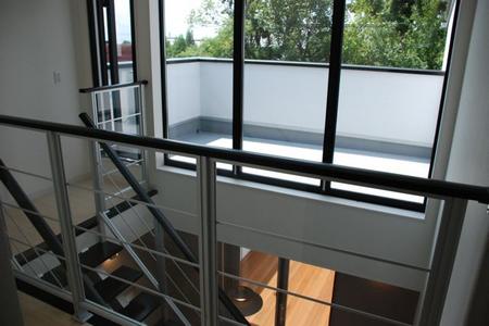 アパートでした、多分古いアパートと店舗を併せてリノベーション 上手いですね ちょっと住んでみたいと思わせます それではクラスカに行きましょう (祢津) 進行中長野市H邸2008年06月19日22:02折角のブログなのに と言う事で 私と弊社のクライアント様との最初の出会いは様々ですが Hさんは若いご夫婦です。 ご主人「え〜やっぱりい サッシュは黒が良いかな〜っと」 さて、設計概要です ただH邸の敷地は途中から道路より70センチ位下がっていて (アトリエをよけて中庭を配置 通路の奥に見える細長い窓はキッチンの窓) プラン上のコンセプトは 玄関を入って正面が吹き抜けでスケルトン階段が見える事 スケルトン階段は実はダイニングルームから上がるようになっており 玄関から階段は見えるがダイニングは見えないようにする事 でもダイニングの奥の中庭は玄関から見えるようにする 等という厄介な(失礼)いややりがいの有るものでした 敷地を拝見すると南に高い木があり場内が暗い感じに見えました (吹き抜けに面した二階の主寝室から庭を望む)