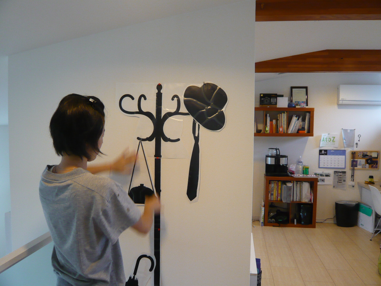 半分解放すると庭に立っている本当の木が見えます 引き渡し後お邪魔すると玄関にご主人が作成したフロアースタンドが